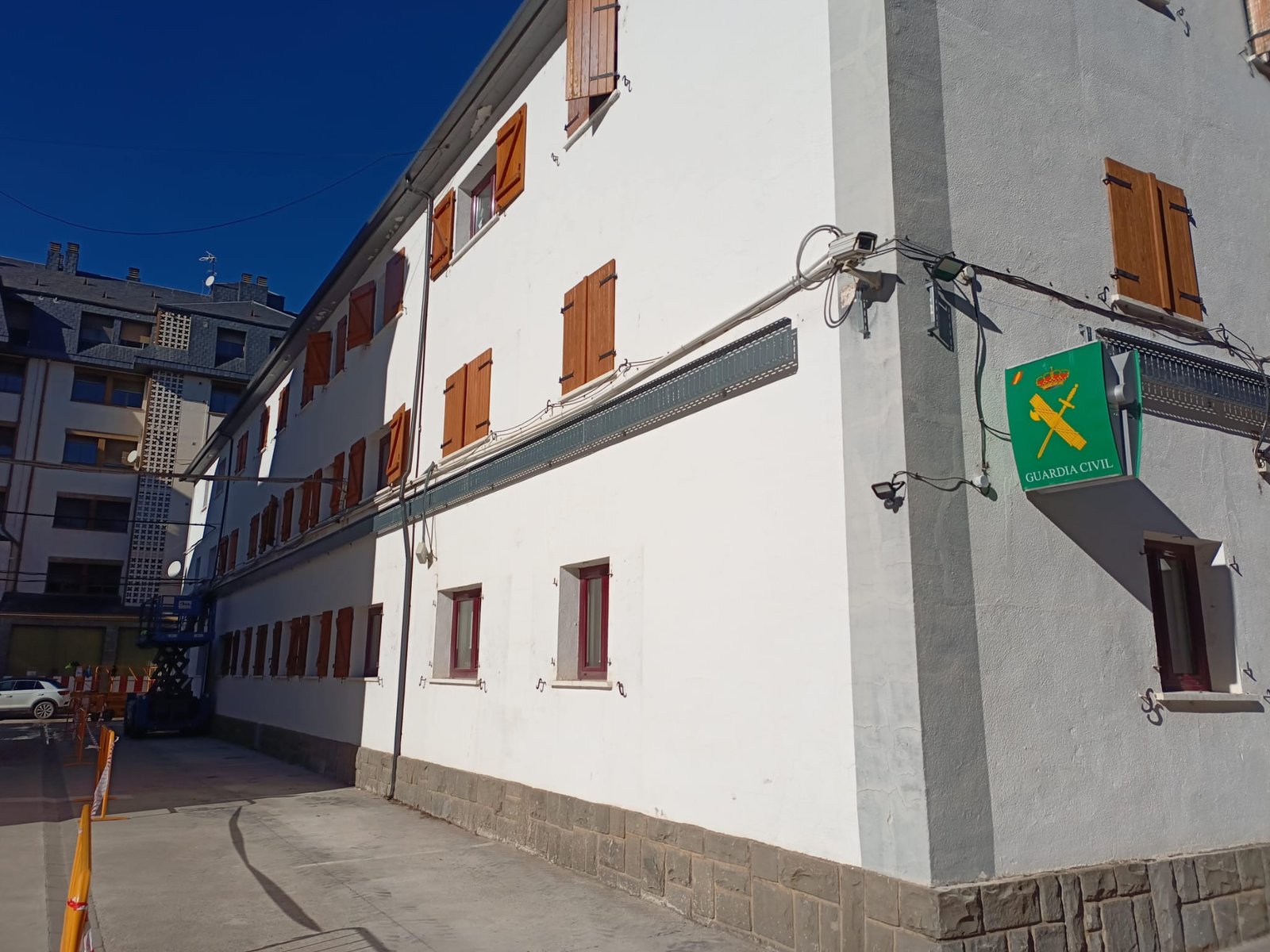 Cuartel guardia civil Jaca, cliente Elecnor instalación eléctrica general y reubicación y retirada de cableados en fachadas.